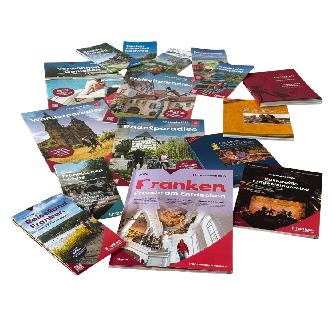 Unsere Broschüren können kostenfrei von Mitgliedern angefordert werden, beispielsweise zur Auslage in Tourist-Informationen. Durch die gemeinsame Präsentation des vielfältigen Informationsmaterials zeigen wir Franken als attraktives Reiseziel. Mitglieder tragen damit aktiv dazu bei, Gästen einen umfassenden Überblick über die touristischen Angebote in unserer Region zu geben und die Stärke der fränkischen Tourismusfamilie sichtbar zu machen.